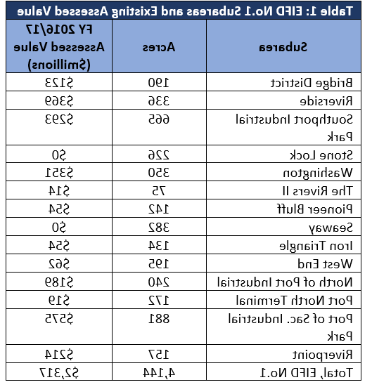 EIFD描述. 1: EIFD没有.1由14个分区组成, 包括大约4,144英亩, 占整个西萨克拉门托的25%. 这些分区包含了一套不同的土地用途,从计划进行河滨混合用途发展的地区, 大部分已建成的工业和零售区. 下面的表1概述了14个分领域的现有情况.